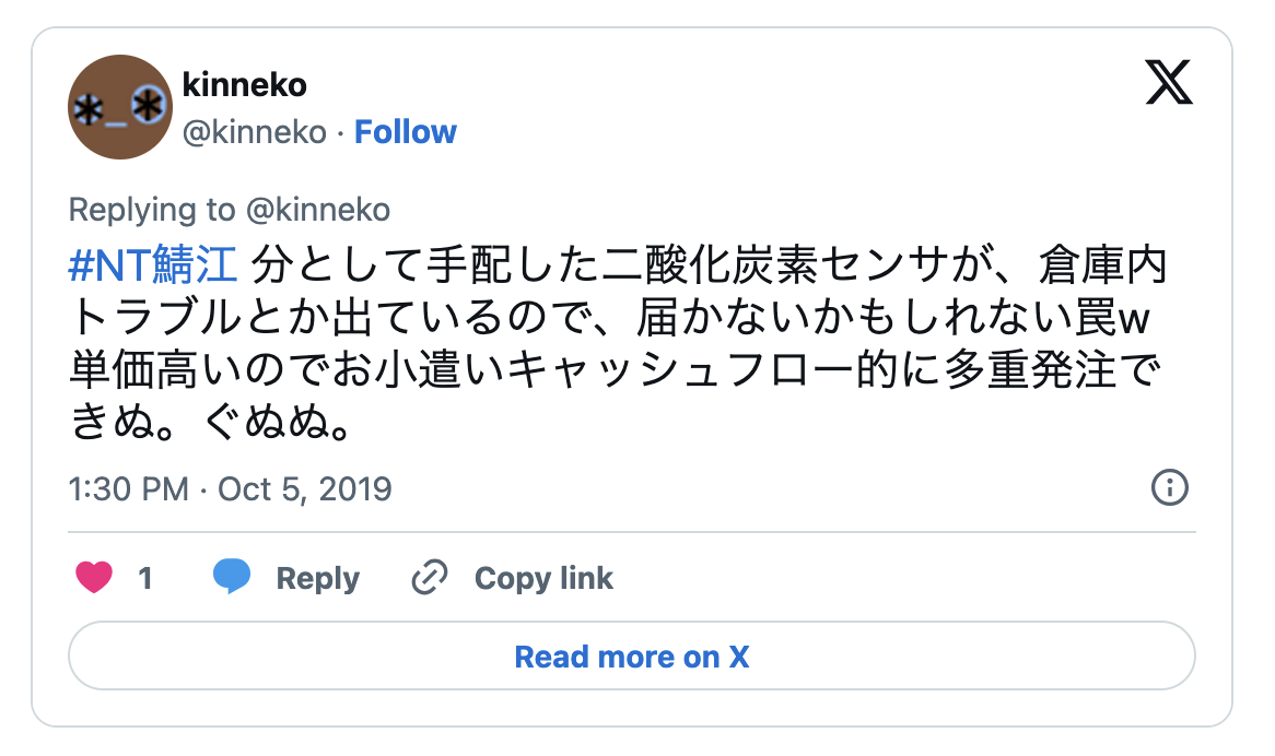 #NT鯖江 分として手配した二酸化炭素センサが、倉庫内トラブルとか出ているので、届かないかもしれない罠w 単価高いのでお小遣いキャッシュフロー的に多重発注できぬ。ぐぬぬ。