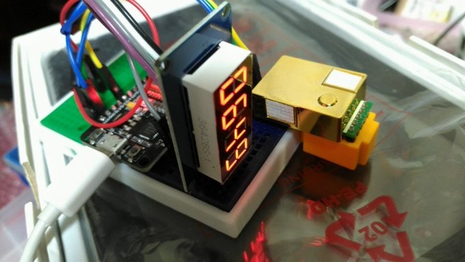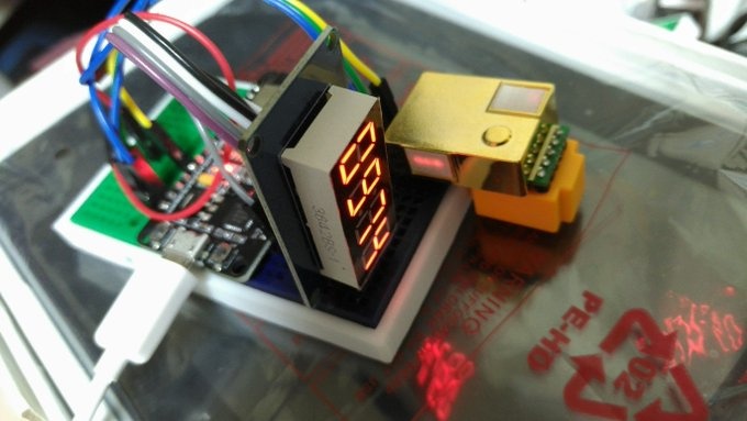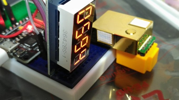 ESP32モジュールにCO2センサを組み合わせて、値を4桁7セグに表示できる単純なものだ。せっかくEPS32モジュールであるNodeMCU-32Sを使っているのに、無線もBluetoothもまったく使っていないというふざけたキットだ。(もっとも、最初はセンサの値をGASを使ってGoogleスプレッドシートに蓄積し、最新の10個の値をグラフ化して、PWA化してスマホで見るというデモも作ったことはある)