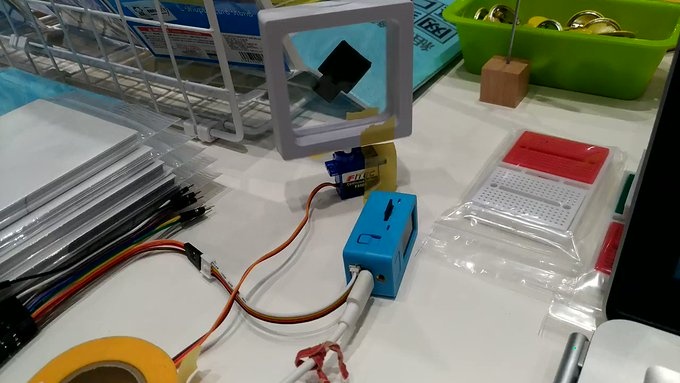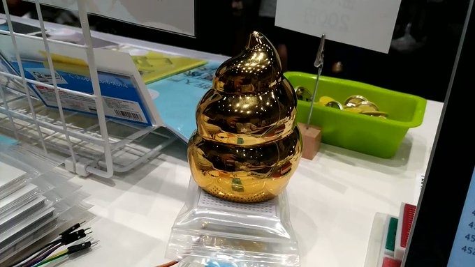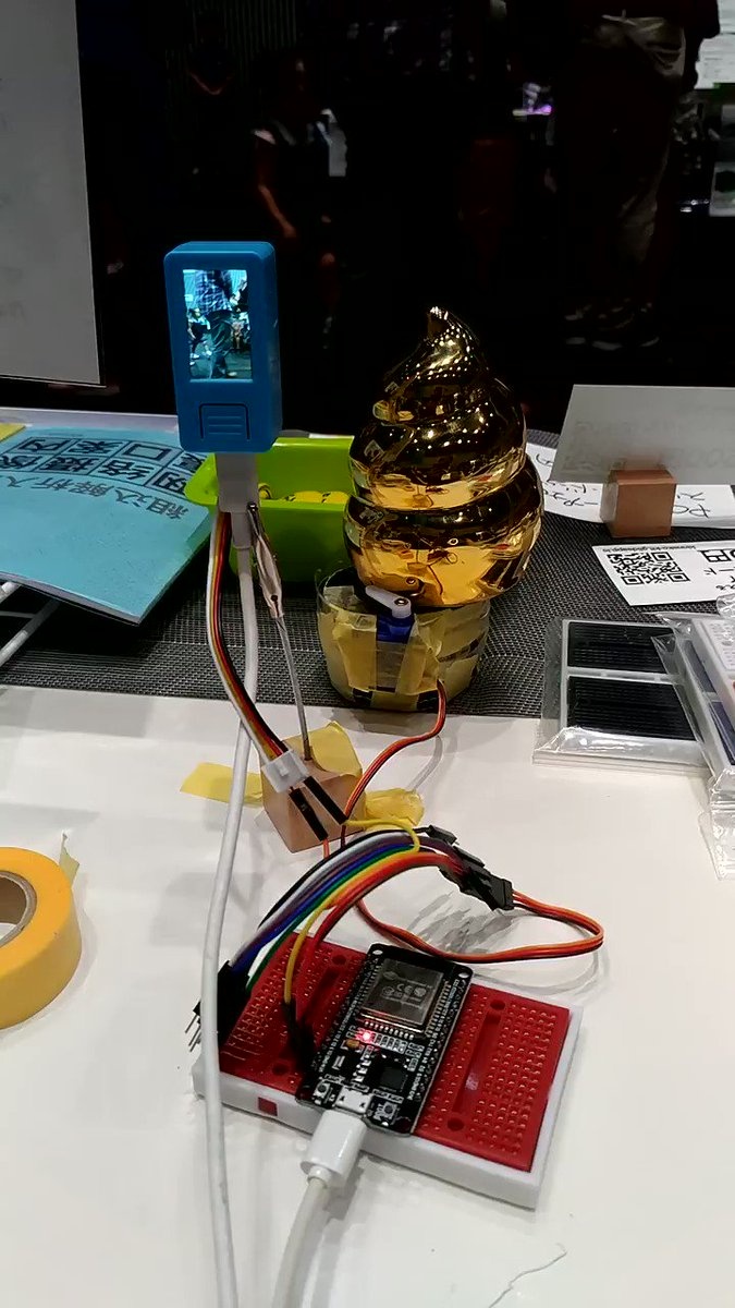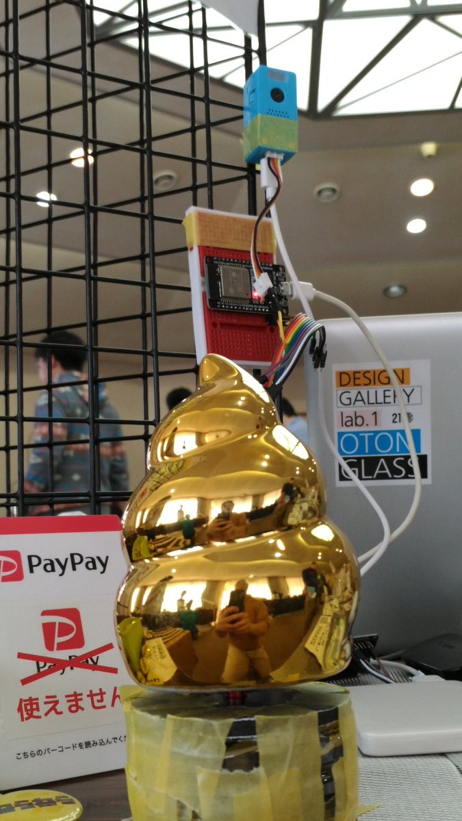 展示には光り物と動き物があると、人寄せになる。金のウンコを餌に、ちょっとびっくりさせるようなデモを作ってみようと思いついた。NT名古屋での展示があまりに暇だったのでw 基本的には顔認識して、金のウンコを少し動かすというデモになる。 顔認識は、たまたまその時持っていたM5StickVを使うことにした。 金のウンコを動かすには、サーボモーターを使った。これもなぜか荷物の中に入っていた。 残りの材料は、その日の宿の豊田市駅のそばの100均で調達した。ウンコを支える軸には、ノック部に真珠のような玉飾りがついた極細のシャープペンシル。シャープペンシルを支える台には、飲み終わったペットボトルの下の部分、そこに工作用のスチレンボードを丸く切って何枚か入れる。それに、サーボモーターをマスキングテープで貼り付ける。