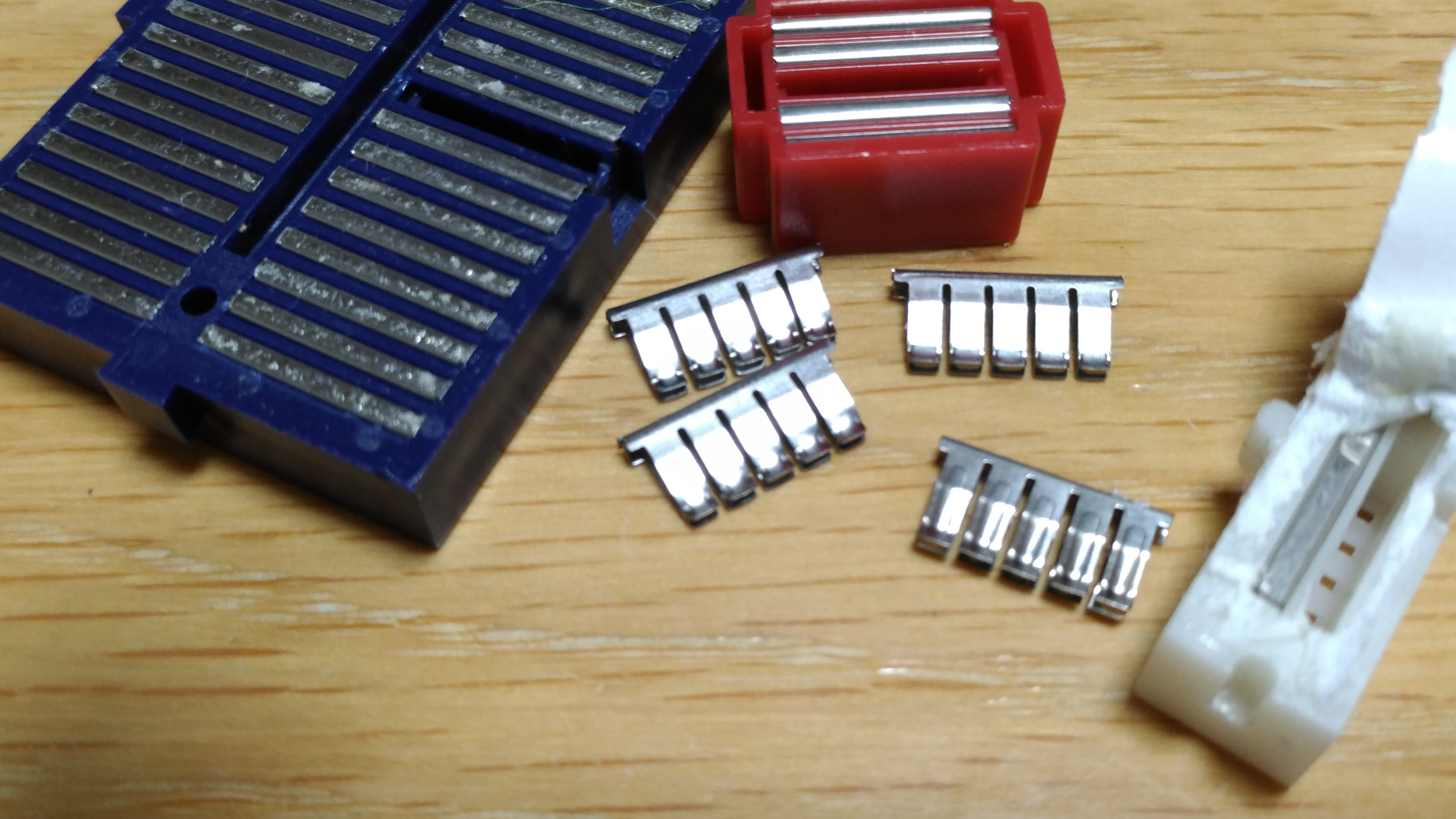 ブレッドボードは比較的安い製品なので、板バネを多く使った製品を輸入して、板バネだけを取り出すことも考えてみたが、治具を作って数台やってみて、手間もかかり、ゴミがたくさん出る割には不毛なのでやめた。