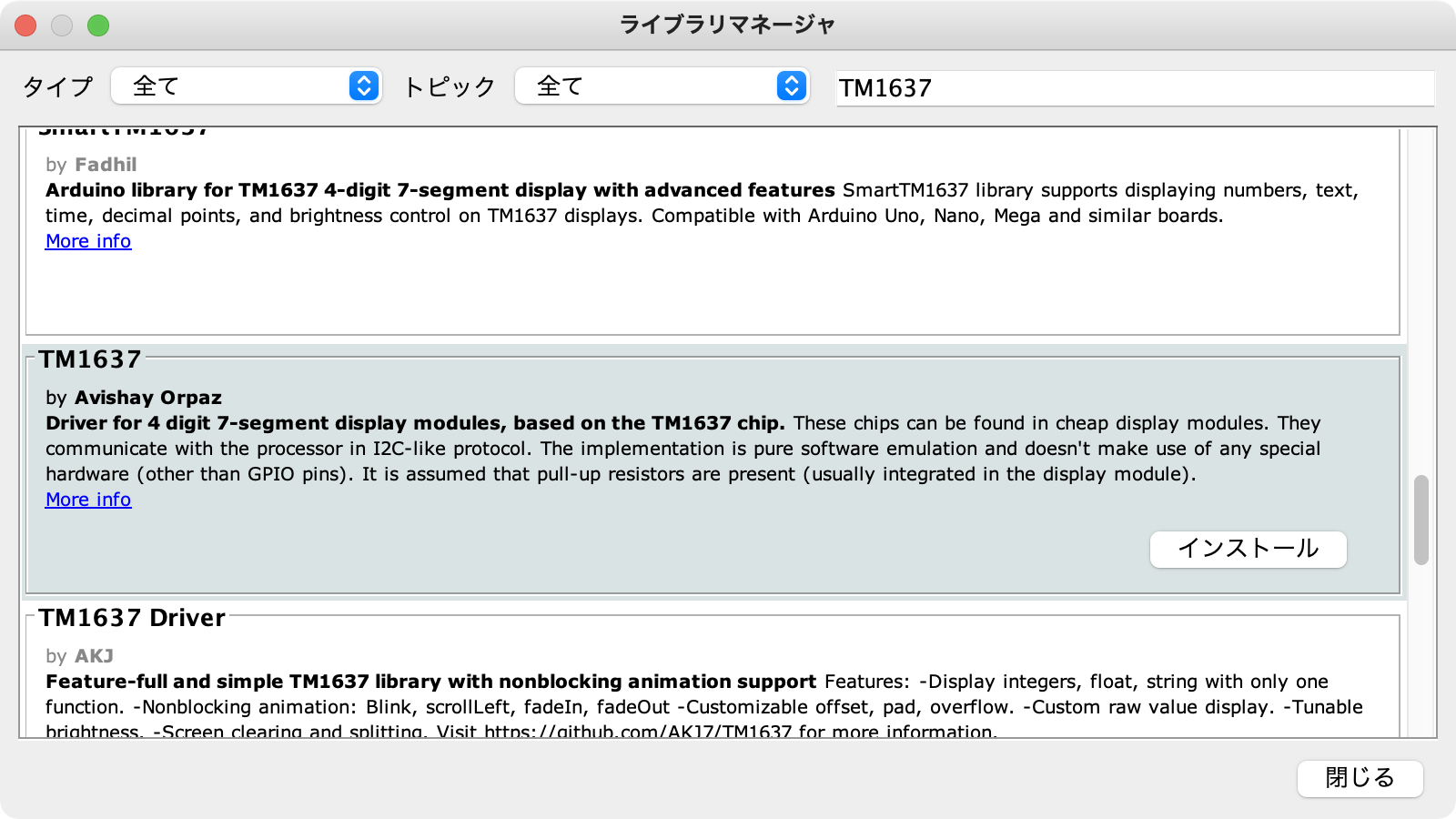 ライブラリマネージャで検索すると、なんか、他にも使えそうなのがいっぱいあるけど、これかな? バージョンは2.0.17。入れる。