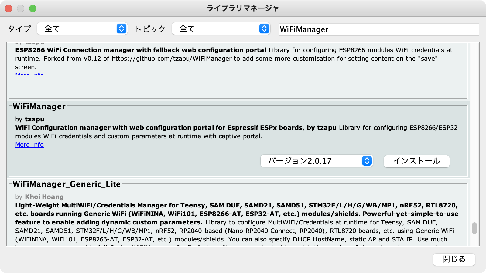 今回は細かい設定や画面の変更はいらなさそうだし、シンプルなWiFiManagerにしておくか。