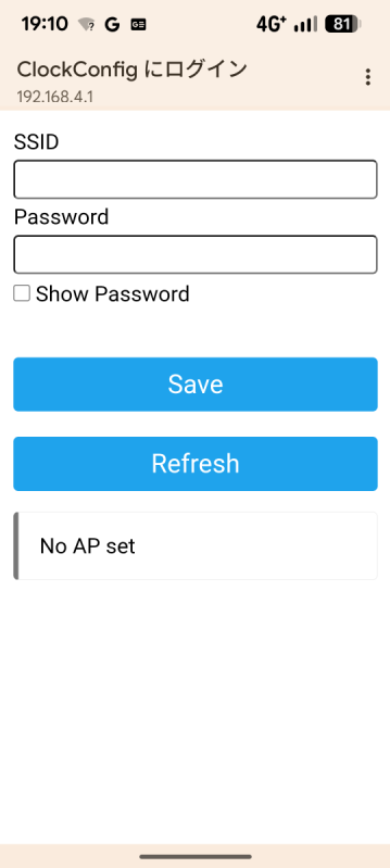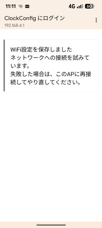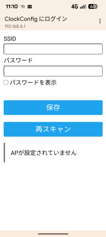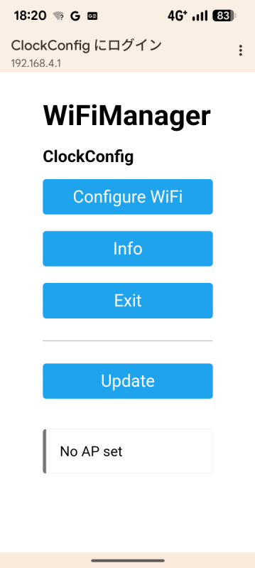 WiFi設定のシーケンスは、まず、初回起動で知っている無線接続先がない場合は、「-- --」表示になる。 リセットのカウントダウンも変更されている。背面のボタンを押すと、200からカウントダウンするので押し続けると、「PUSH」と表示したあと、「-- --」表示になる。 APが動いているので、ClockConfigというSSIDのAPにパスワードなしで接続する。 手持ちのAndroid端末では、キャプティブポータルの動作は問題なく、ブラウザが自動で開いて接続用のWiFiManagerの画面に移動する。