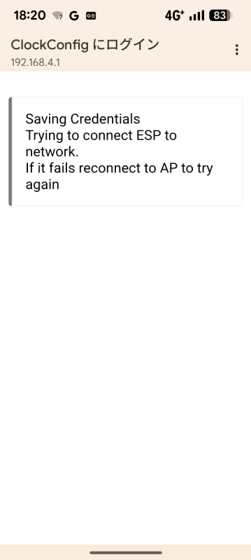 時計側は、APに接続を試みる「conn」表示になる、接続できると「Sync」と表示して時刻同期して、時刻表示のループにはいる感じ。コロンも毎秒点滅している。
